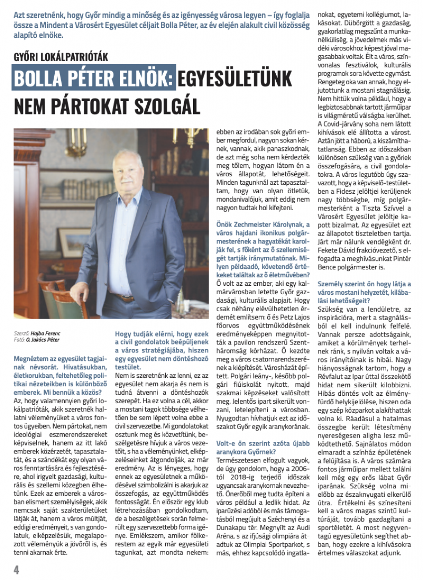 Győr és környéke hetilapjában, a GyőrPlusz újságban jelent meg írás egyesületünk elnökével, Bolla Péterrel
